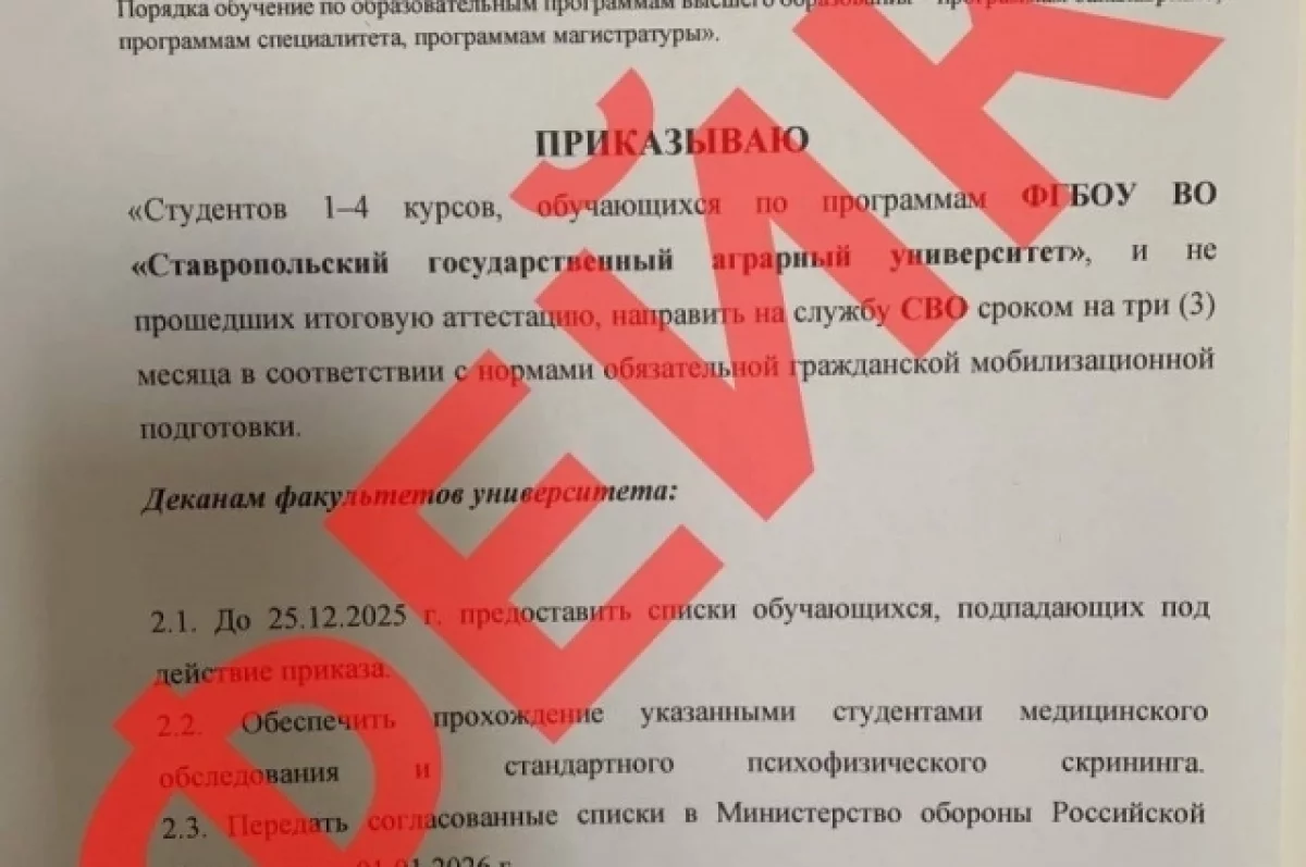 Речь идёт о поддельном приказе, который рассылается в социальных сетях и мессенджерах под видом официального документа СтГАУ. В нём говорится о принудительной отправке на спецоперацию не сдавших экзамены студентов 1 — 4 курсов, на срок в три месяца. Фальшивка датирована 24 ноября.